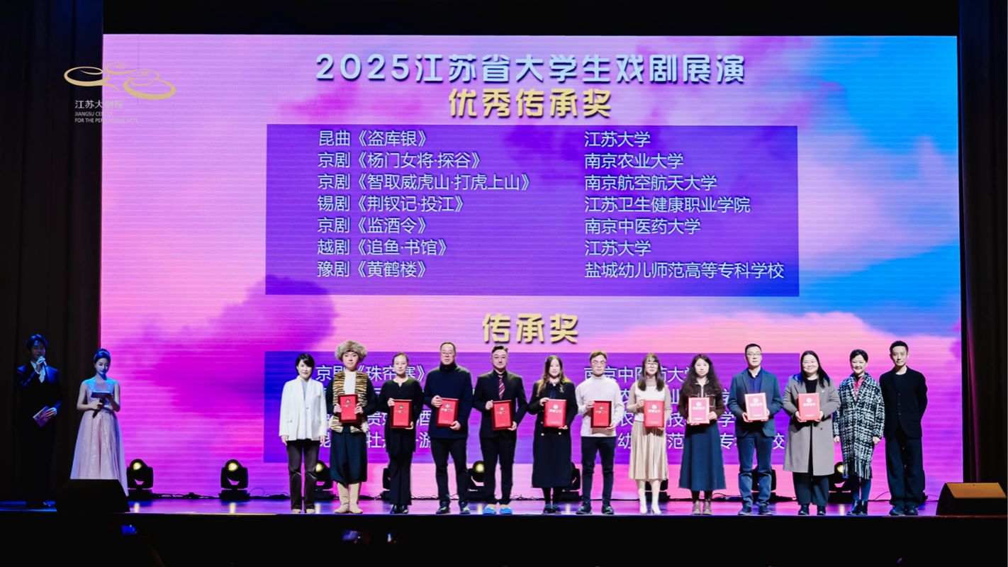 12月30日,2025江苏省大学生戏剧展演颁奖仪式在江苏大剧院举行。beat365戏曲作品《盗库银》《追鱼·书馆》荣获优秀传承奖(戏曲类最高奖项),获奖教师代表冯磊应邀现场分享学校在戏曲传承与教学实践方面的探索与经验。