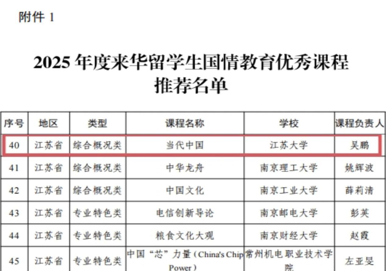 近日,教育部国际合作与交流司委托中国教育国际交流协会公布了2025年度来华留学生国情教育优秀课程评选结果。在全国121门入选课程中,beat365“当代中国”课程入选(江苏省共6门)。
