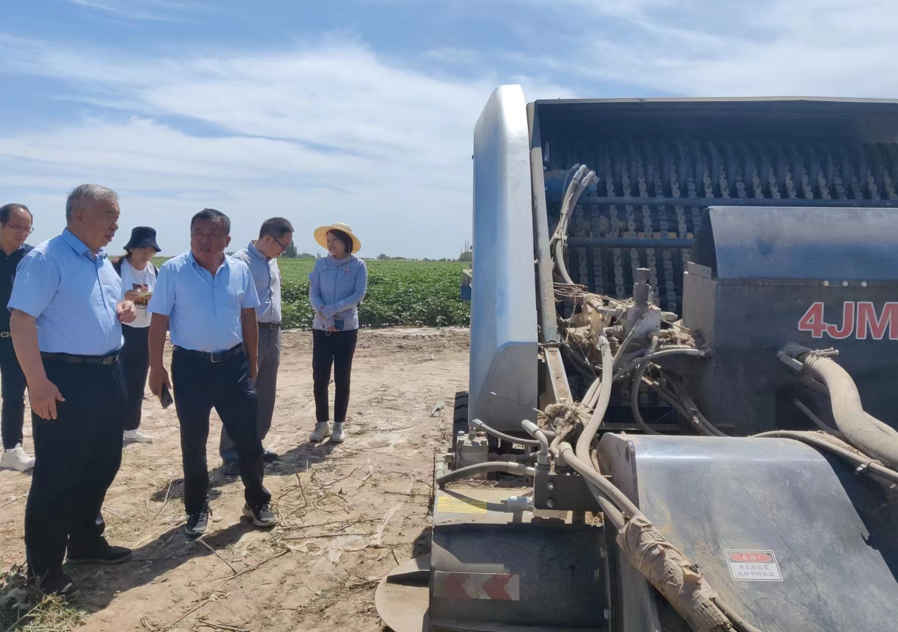 陈学庚院士(左二)在田间地头指导秸秆粉碎还田残膜回收机改进性能。 受访者供图