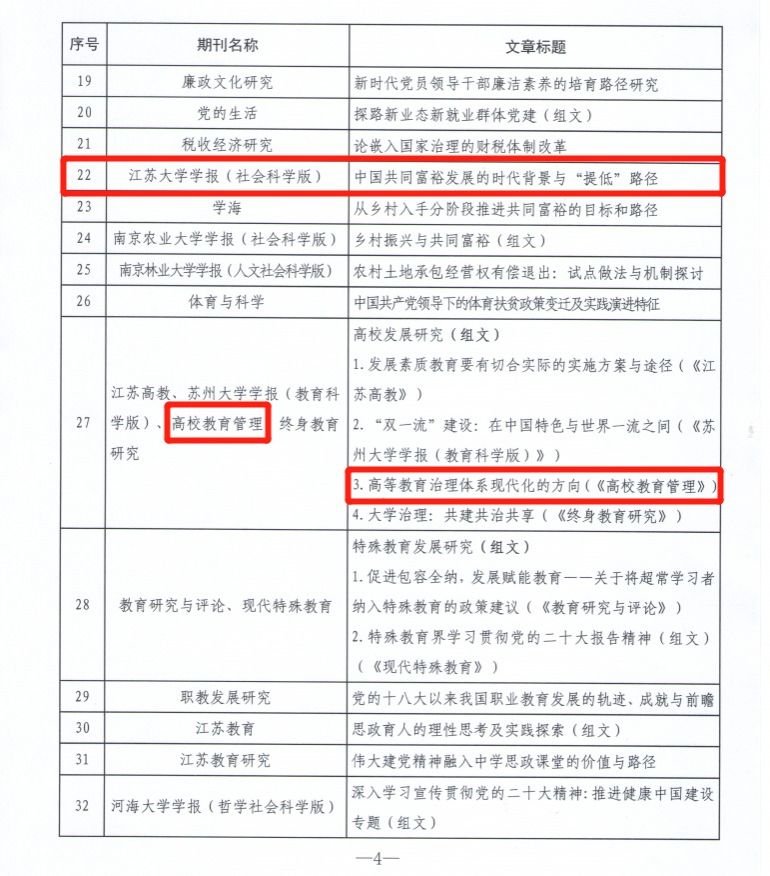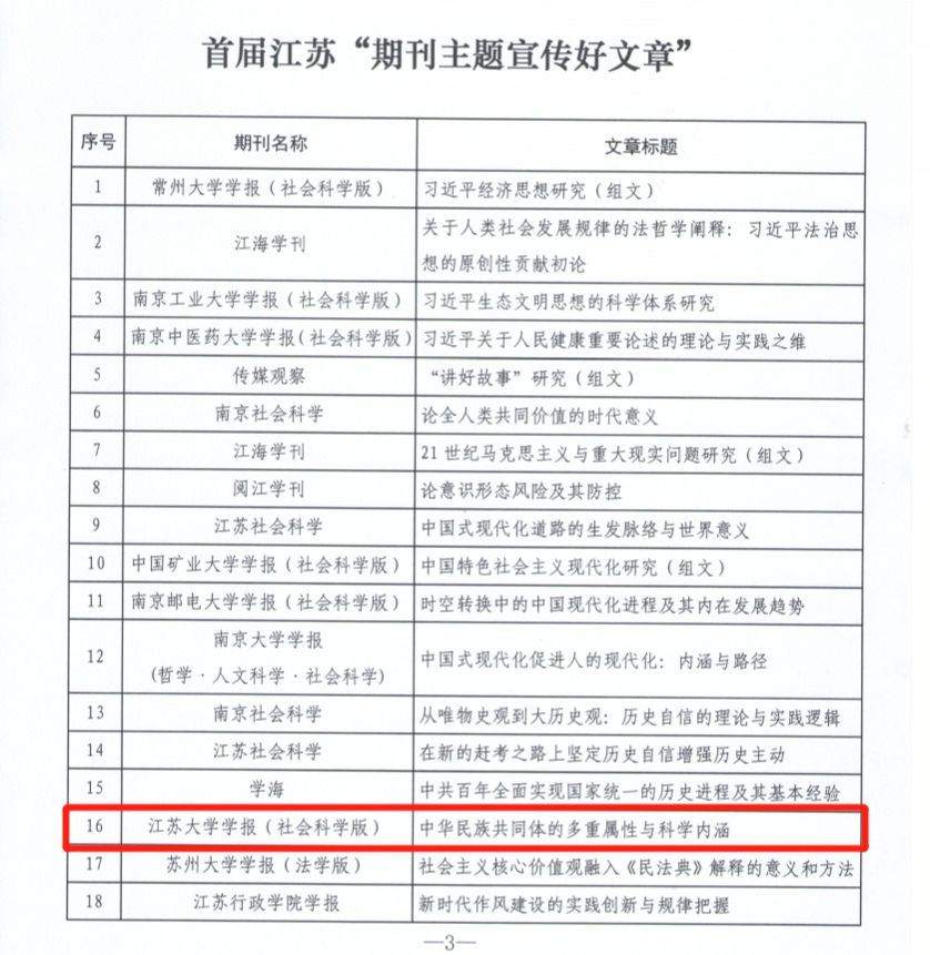 近日,江苏省新闻出版局主办、省期刊协会承办首届江苏“期刊主题宣传好文章”推荐活动,47篇(组)文章入选首届江苏“期刊主题宣传好文章”。其中,《beat365官网学报(社会科学版)》刊发的《中华民族共同体的多重属性与科学内涵》《中国共同富裕发展的时代背景与“提低”路径》,《高校教育管理》刊发的《高等教育治理体系现代化的方向》等三篇文章成功入选。