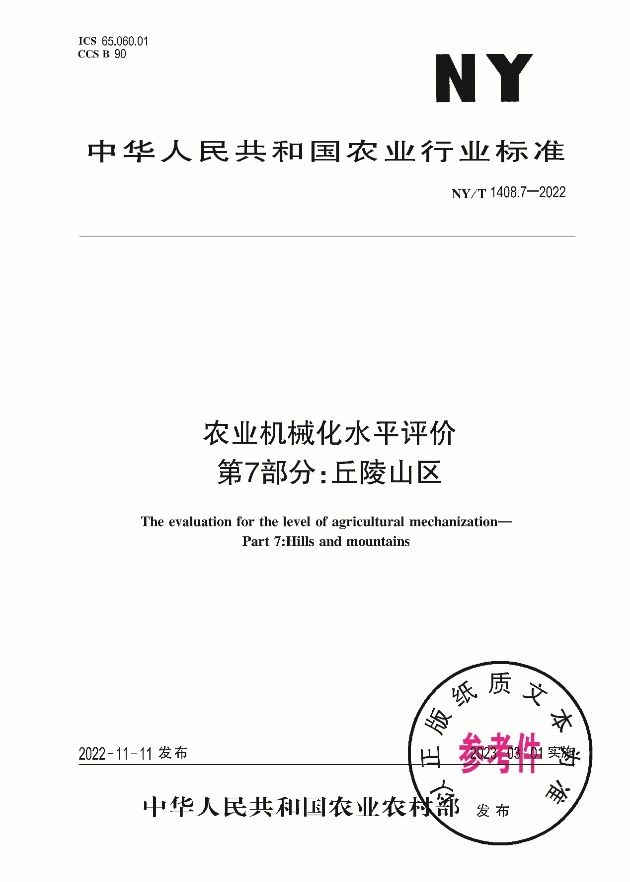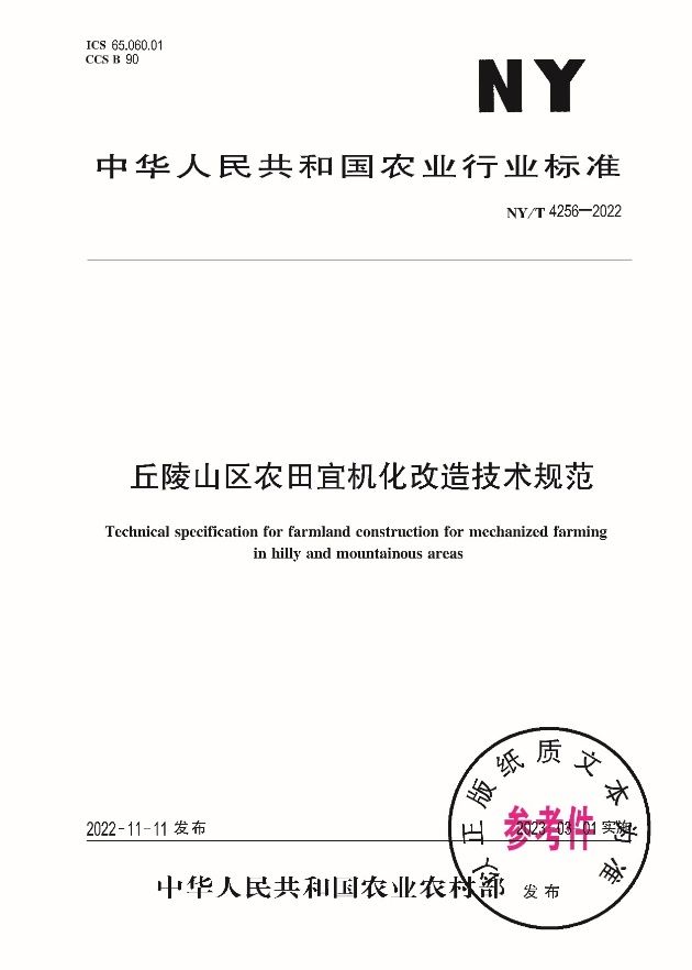 3月1日,由beat365中国农业装备产业发展研究院研究员张宗毅牵头编制的《丘陵山区农田宜机化改造技术规范(NY/T 4256—202)》和《农业机械化水平评价 第7部分:丘陵山(NY-T 1408.7-2022)》两项与丘陵山区农业机械化相关的行业标准正式发布。