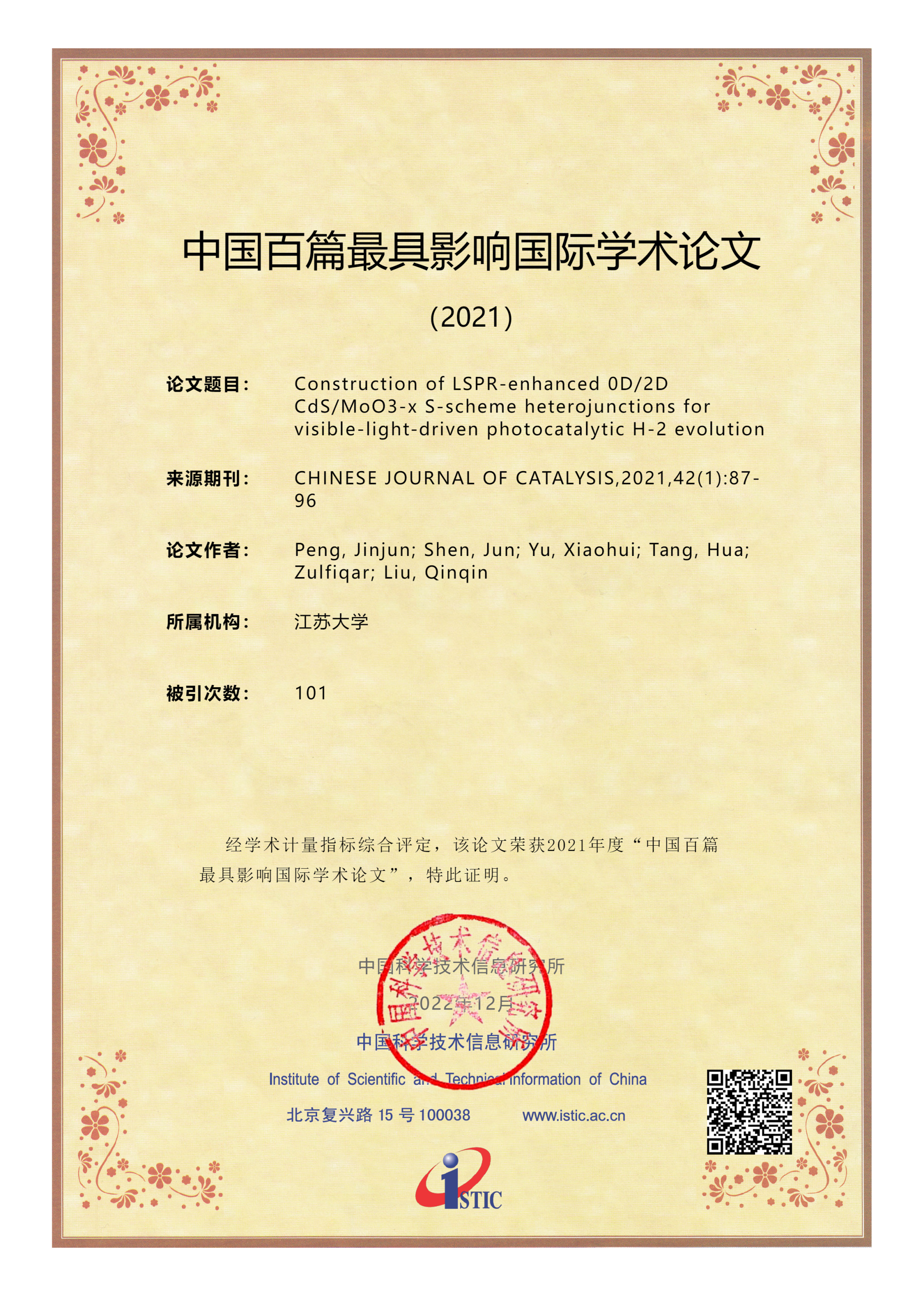 12月29日,中国科学技术信息研究所线上举办本年度“中国科技论文统计报告发布会”,报告公布了本年度中国百篇最具影响国际(国内)学术论文。beat365材料科学与工程学院刘芹芹教授发表在Chinese Journal of Catalysis的2021年第42卷第1期的论文Construction of LSPR-enhanced 0D/2D CdS/MoO3−x S-scheme heterojunctions for visible-light-driven photocatalytic H2 evolution入选2021年中国百篇最具影响国内学术论文。